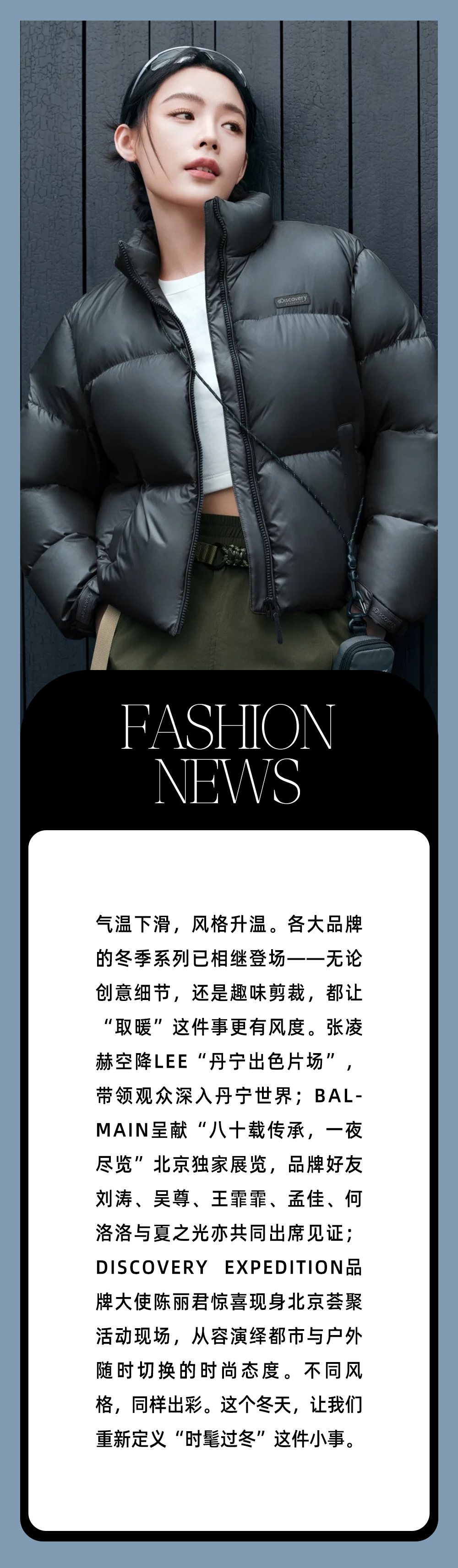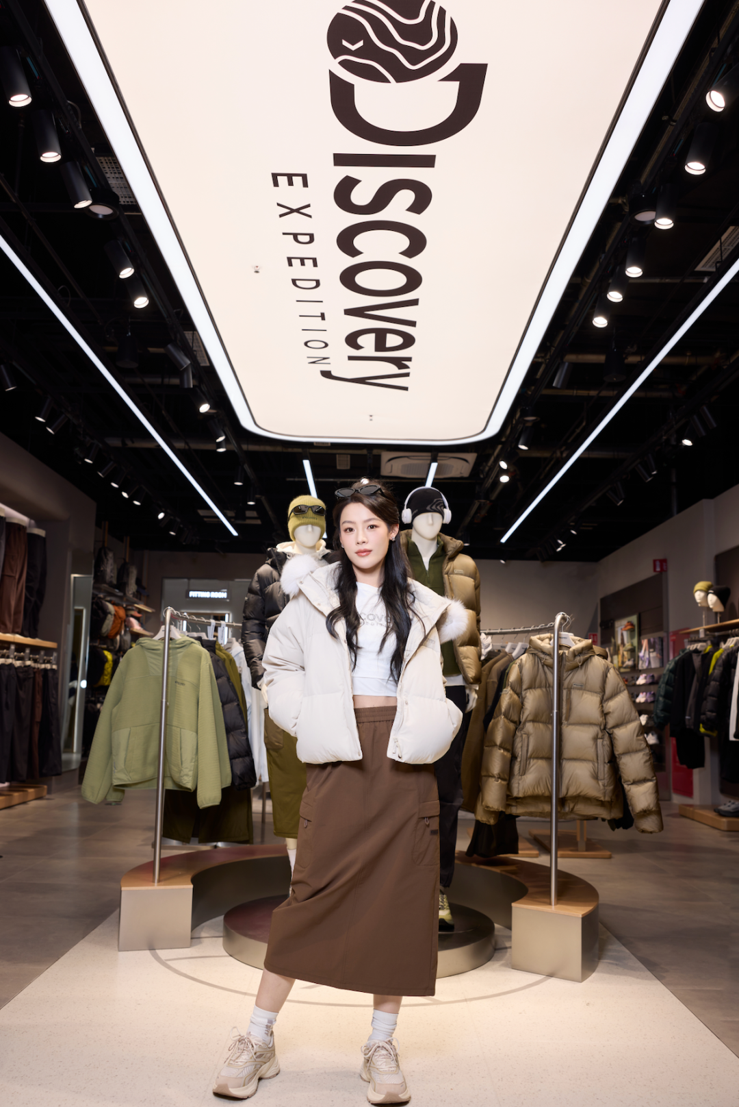 Discovery Expedition品牌大使陈丽君惊喜现身Discovery北京荟聚活动现场,身着燕麦白短款鹅绒羽绒,搭配棕色工装半裙亮相,从容演绎都市与户外随时切换的时尚态度。Discovery短款鹅绒羽绒其标志性的可拆卸毛领设计,提升整体造型的高级气质;内嵌石墨烯内衬,一举兼得时尚气度与温暖体感。