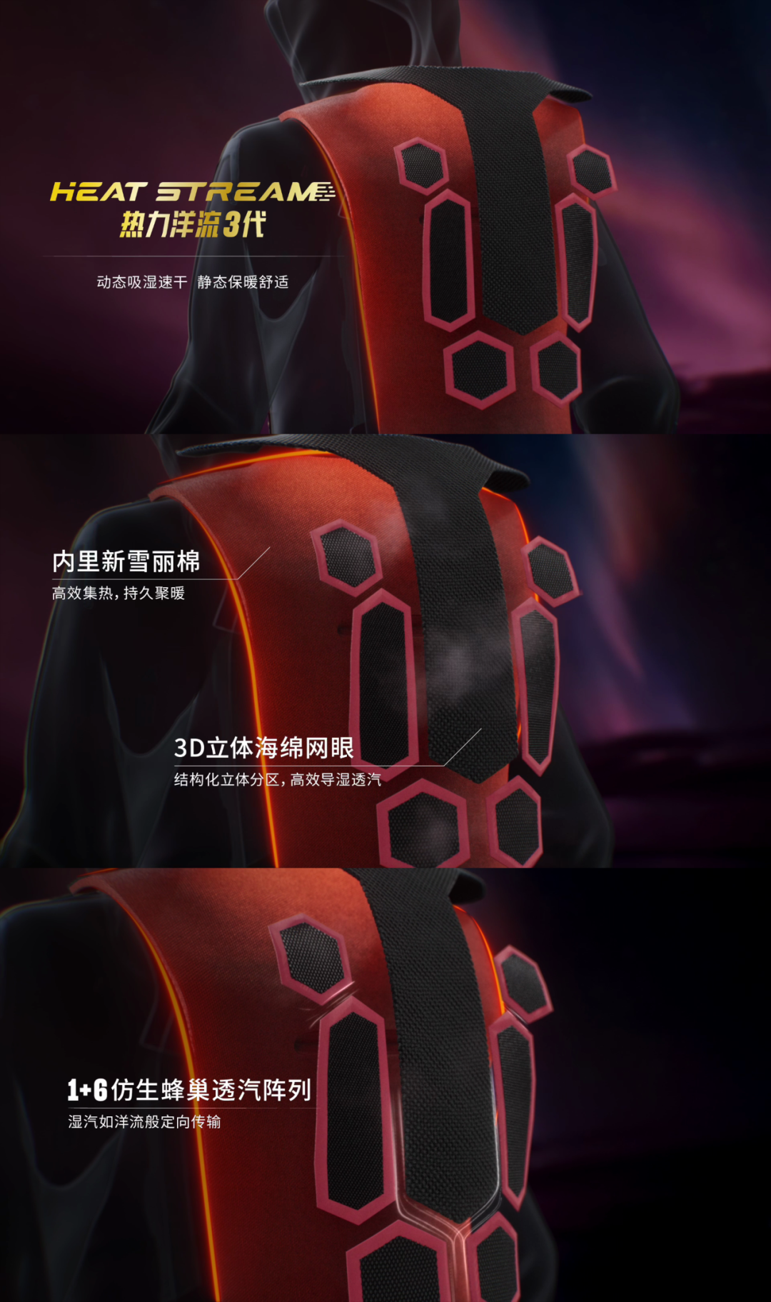 开山雪服V3用热力洋流3代系统(1+6仿生蜂巢透汽阵列),动态排汗、静态锁温;外层Dermizax®面料防雨雪,内衬3M导湿棉保温,完美适配中国雪场。设计上,它修身不臃肿,灵感源自北极极光,女款红黑渐变象征“从挑战到卓越”,雪场、日常穿都合适。