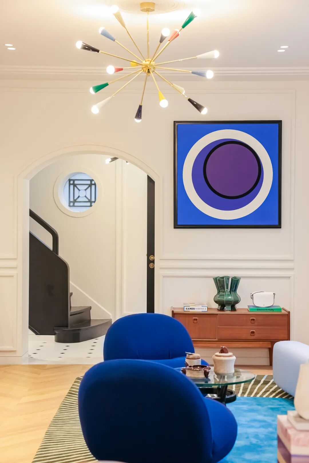空间内部处处彰显法式生活艺术。鱼骨拼木地板与装饰线条复刻了巴黎奥斯曼风格的优雅气韵。一层的客厅以艺术与交流为主题,陈列着珍贵的珑骧历史藏品——赛道模型、烟灰缸、香烟分配器与烟草罐。法国现代设计大师Pierre Paulin的蓝色沙发成为视觉焦点,上方悬挂几何抽象先锋Geneviève Claisse 的蓝色画作《H Luz 》(1970),展现纯粹形态与色彩的和谐之美。