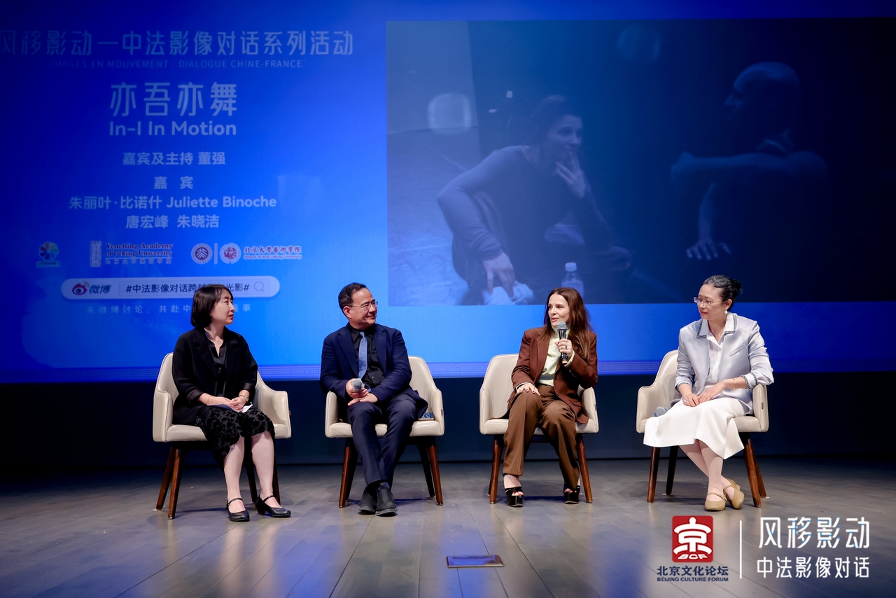作为“永不落幕的北影节”的系列活动之一,9月23日下午,法国著名演员、导演朱丽叶·比诺什携其导演首作《亦吾亦舞》走进北京大学,举行影片放映暨大师课对谈活动。影片《亦吾亦舞》源自比诺什2007年与编舞大师阿库·汉姆合作的舞台剧《我之深处》(IN-I),通过电影语言重构了台前幕后的创作过程,展现了艺术诞生中的灵感火花与不懈坚持。放映结束后,比诺什与北京大学燕京学堂院长董强、艺术学院副院长唐宏峰、外语学院法语系副教授朱晓洁展开对谈,并与北大学子、影迷和舞者进行深入交流。