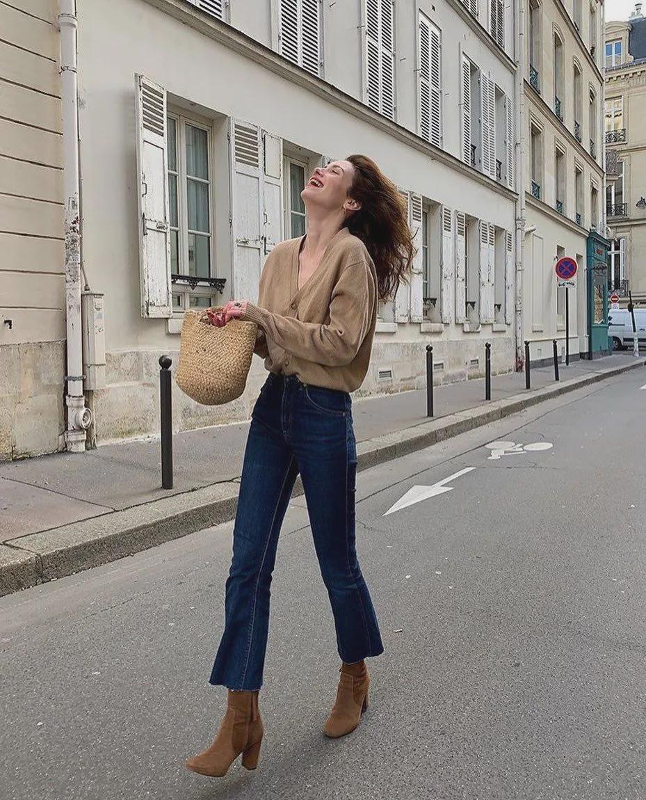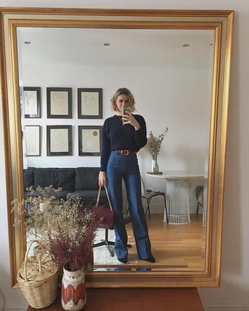 “喇叭裤+针织衫”的穿法可是法式穿搭中颇为经典的一套 look 哦。针织本身柔软、慵懒,很符合法式穿搭法的主旋律。搭配随性感更强的喇叭裤,夏天配凉鞋,冬天配靴子,一年至少有两个季节可以这样凹造型。