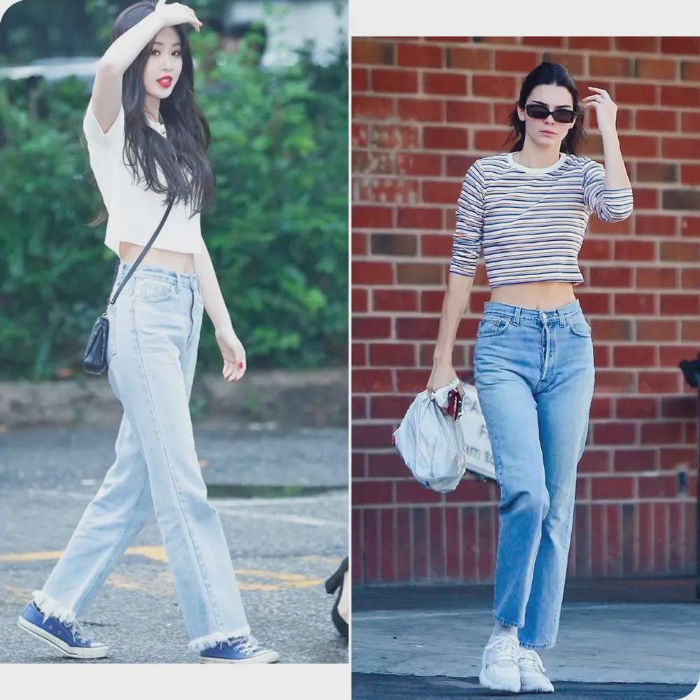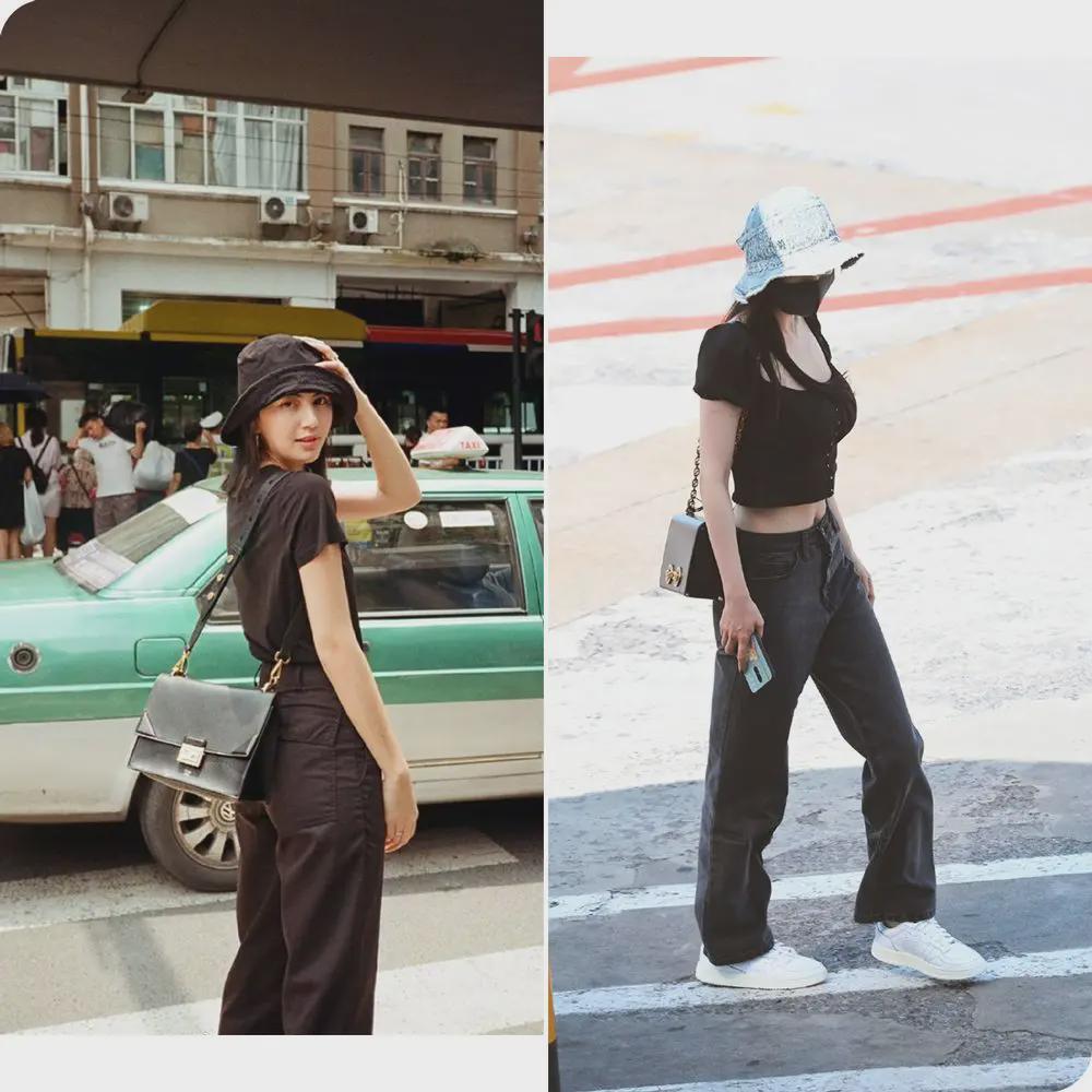喇叭裤+T恤:挑选一条喇叭裤,随性地搭配 T 恤,就能轻松显瘦。短上衣搭配牛仔裤,再微微露出小蛮腰,打造出都市街头风,腿长瞬间一米二,比例超棒!这种搭配简单又时尚,非常适合日常出街。